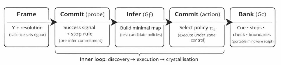 Frame (Y + resolution) → Commit (probe + stop rule) → Infer (Gf) → Commit (action) → Test → Bank