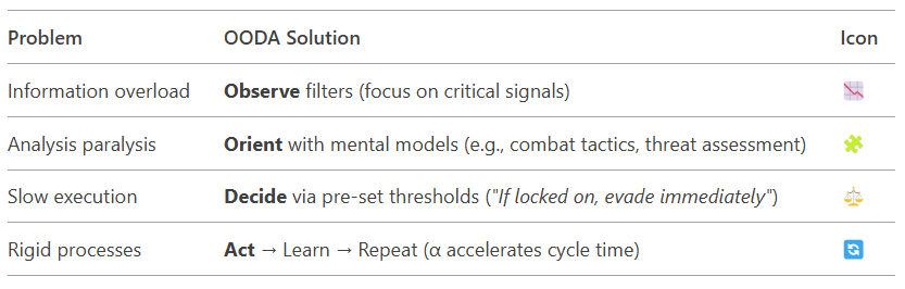 The OODA loop isn’t just a decision-making tool - it’s a 'weapon'. By cycling faster than your opponent, you disrupt their ability to act, forcing them into reactive, defensive postures. This is the essence of decision dominance.